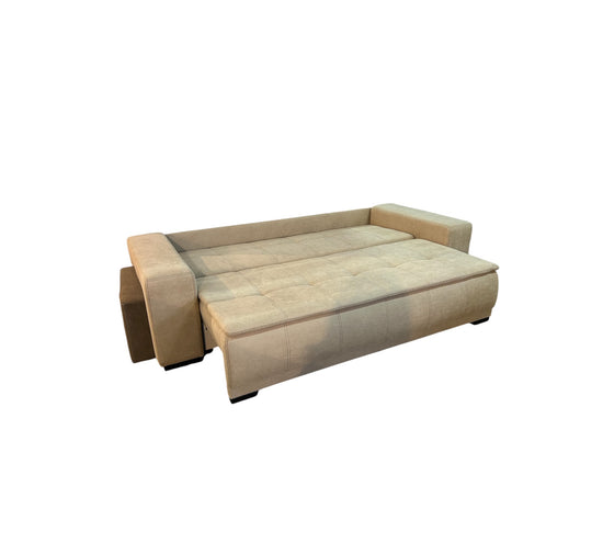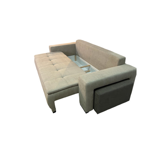 Canapea extensibila cu lada de depozitare, tabureti inclusi in brat, structura din cherestea de fag, pal melaminat, spuma poliuretanica si arcuri sinusoidale.