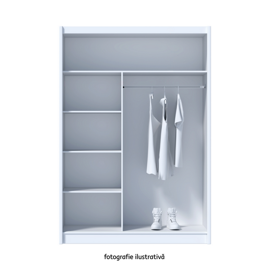 Material: PAL melaminat / margini ABS /fâşii MDF folie / sticlă Culoare: alb / stejar craft Dimensiuni (LxAxÎ): 150x61x215 cm Grosimea PAL: 1,6 cm Grosimea lamelelor: 2,5 cm Grosime ABS: 0,045 cmCapacitatea de încărcare a raftului: 5 kg Capacitatea de încărcare a cuierului: 5 kg Cu uşi glisante Cu oglindă Zonă cu rafturi Bară pentru umeraşe Uşă dublă Nu este indicat să împovăraţi blatul superior Livrat dezasamblat
