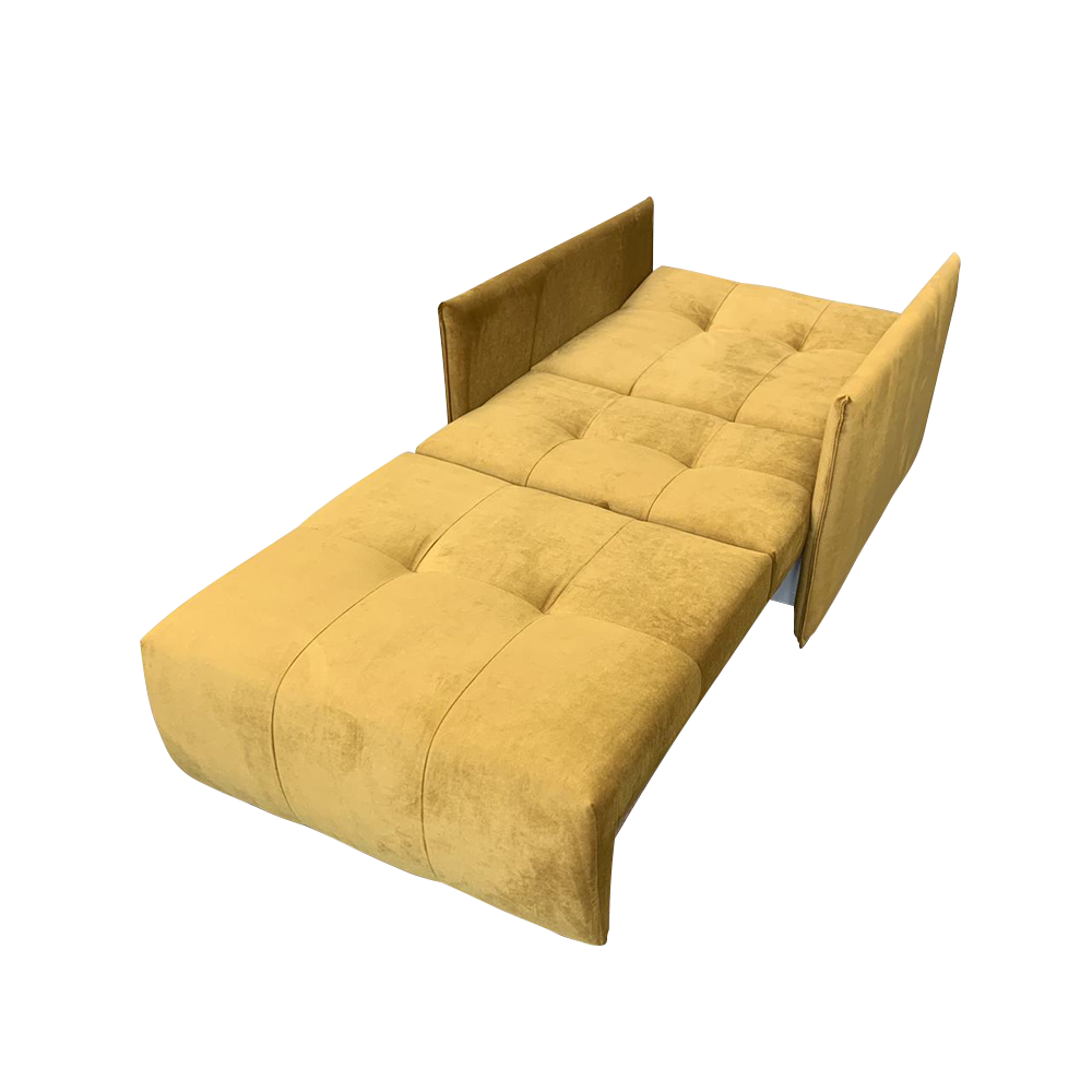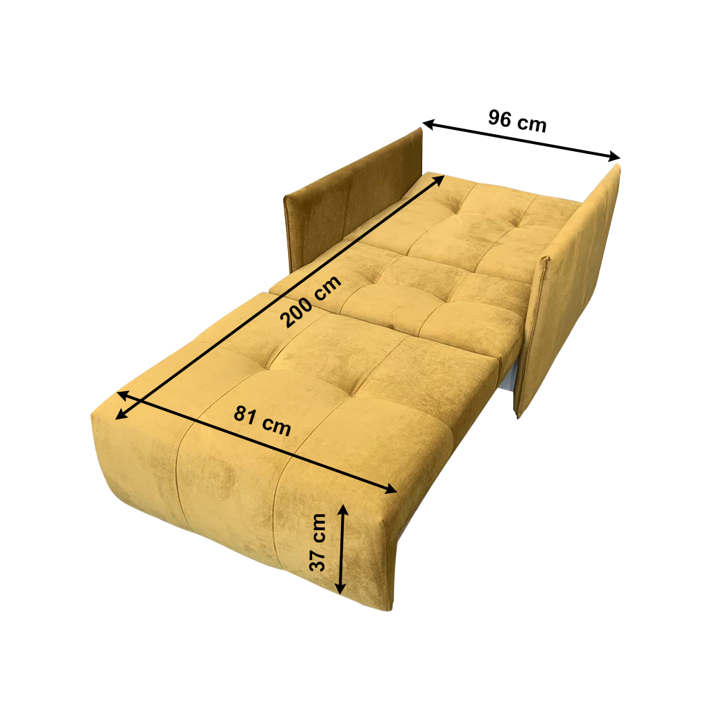Material: ţesătură Riviera 41 Rezistenţa la abraziune a materialului conform testului Martindale: 90000 abraziuni Culoare: muştar Dimensiuni (LxlxH): 96x105x85 cm Înălţimea scaunului: 37 cm Adâncimea scaunului: 66 cm Capacitate de încărcare: 90 kg Pliere Zona de dormit (Lxl): 81x200 cm Înălţimea spaţiului inferior de la podea: 2 cm Umplutură şezut: arcuri Falista/ spumă PUR 2 perne decorative Spaţiu de depozitare Cu cusături decorative Furnizat nemontat