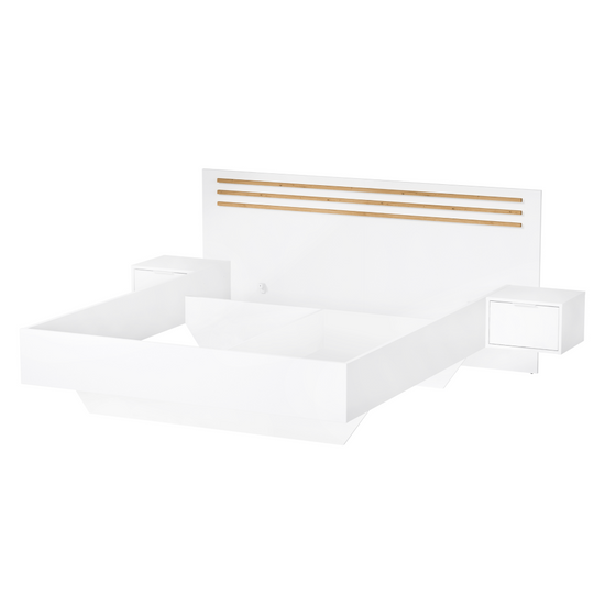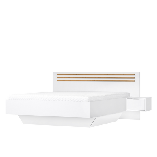 Material: DTD laminat/MDF/margini ABS Culoare: albă/stejar artisan Dimensiuni (lxAxh): 245,2x204x95,2 cm Suprafaţa pentru dormit (lxL): 160x200 cm Grosime material: 1,6 cm Portanţă pe persoană: 110 kg Înălţime până la grătar: 34,9cm 2 noptiere Portanţă noptieră: 20 kg Spaţiu de depozitare Încastrarea saltelei : 10,8 cm Livrat fără grătar Vă recomandăm să achiziţionaţi un grătar STELAR din oferta noastră Livrat fără saltea Posibilitatea de a cumpăra o saltea din oferta noastră Înălţimea recomandată a saltelei: 15 cm Lamele decorative Design modern Livrat dezasamblat