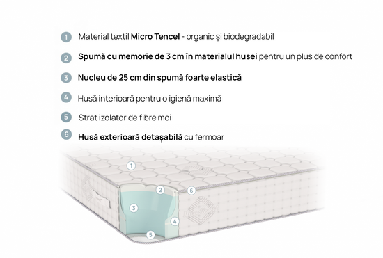 Materialul textil al saltelei este MicroTencel. Are proprietăți naturale antibacteriene, antialergice și antiacariene, absoarbe excesul de căldură din organism și asigură un somn răcoros și odihnitor. Materialul este 100% organic și biodegradabil.